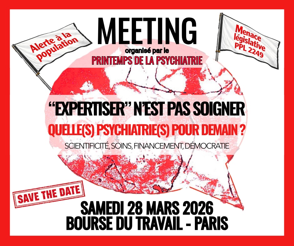 agenda, Évènement, Lois, Pour l'hospitalité en psychiatrie, Printemps de la psychiatrie MEETING le 28/3 à la Bourse du travail 27 janvier 2026 collectif39